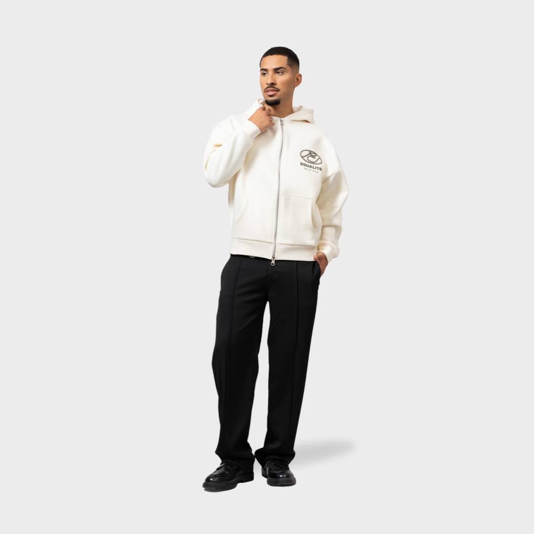Get to know the Equalité Arid Oversized Full Zip Hoodie in Off-white &Taupe. The full-zip top has an oversized fit and features a hood, a two-way zipper, two side pockets, and ribbed cuffs and hem. A taupe puff print from Arid artwork is featured on the left chest and back.