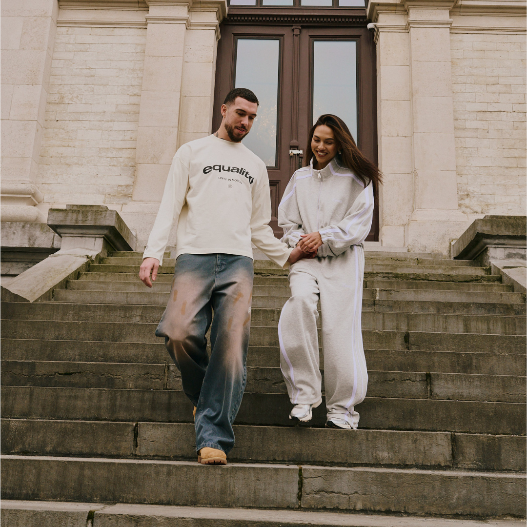 Discover the Equalité Celeste Longsleeve Tee in Off-White. This long-sleeved tee has an oversized fit and features a crew neck. A black screen print of the Celeste artwork appears on the chest and back.