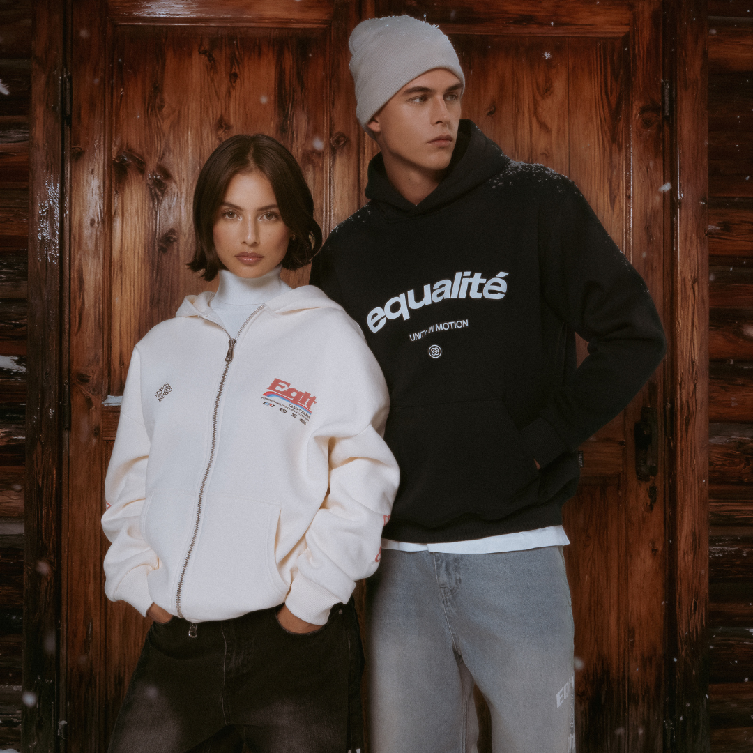 Get to know the Equalité Celeste Oversized Hoodie in Black. This oversized hoodie features a hood, a kangaroo pocket, and ribbed cuffs and hem. A white screen-printed Celeste logo is featured centered on the chest. The hoodie is part of a set and can be paired with matching joggers.
