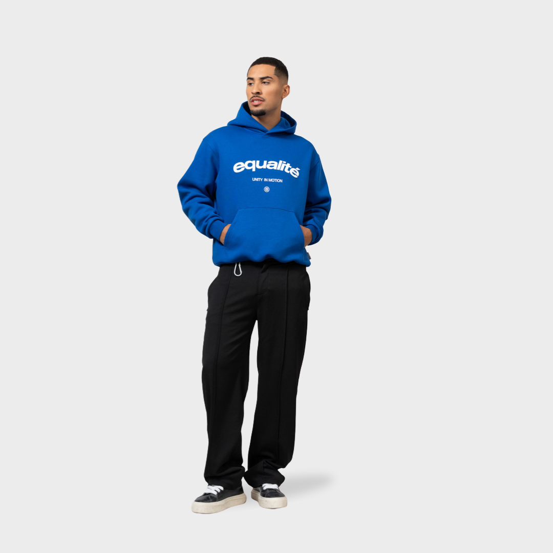 Get to know the Equalité Celeste Oversized Hoodie in Blue. This hoodie has an oversized fit and features a hood, a kangaroo pocket, and ribbed cuffs and hem. A white screen-printed Celeste logo is featured centered on the chest.