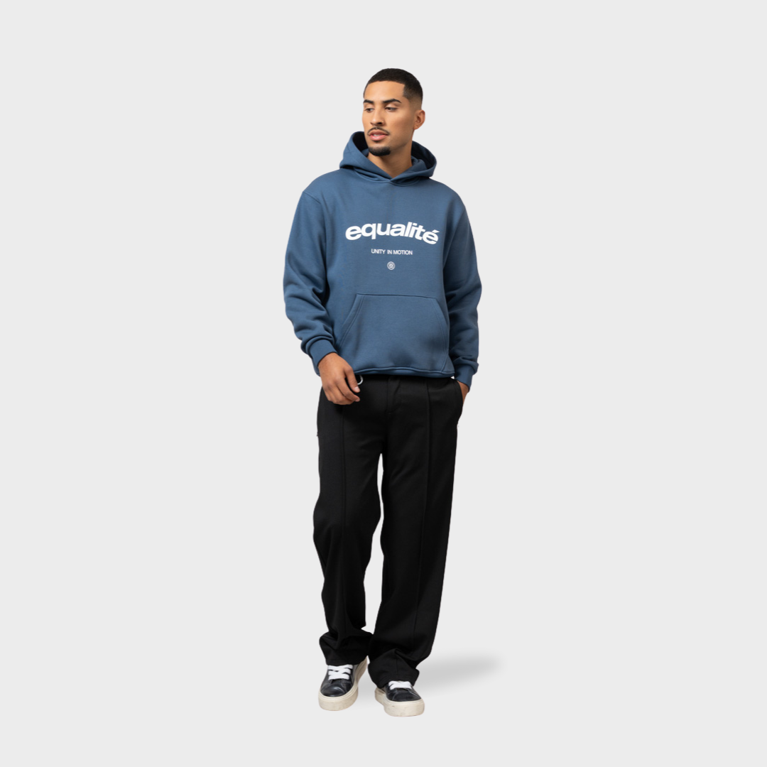Get to know the Equalité Celeste Oversized Hoodie in Navy. This hoodie has an oversized fit and features a hood, a kangaroo pocket, and ribbed cuffs and hem. A white screen-printed Celeste logo is featured at the center of the chest.