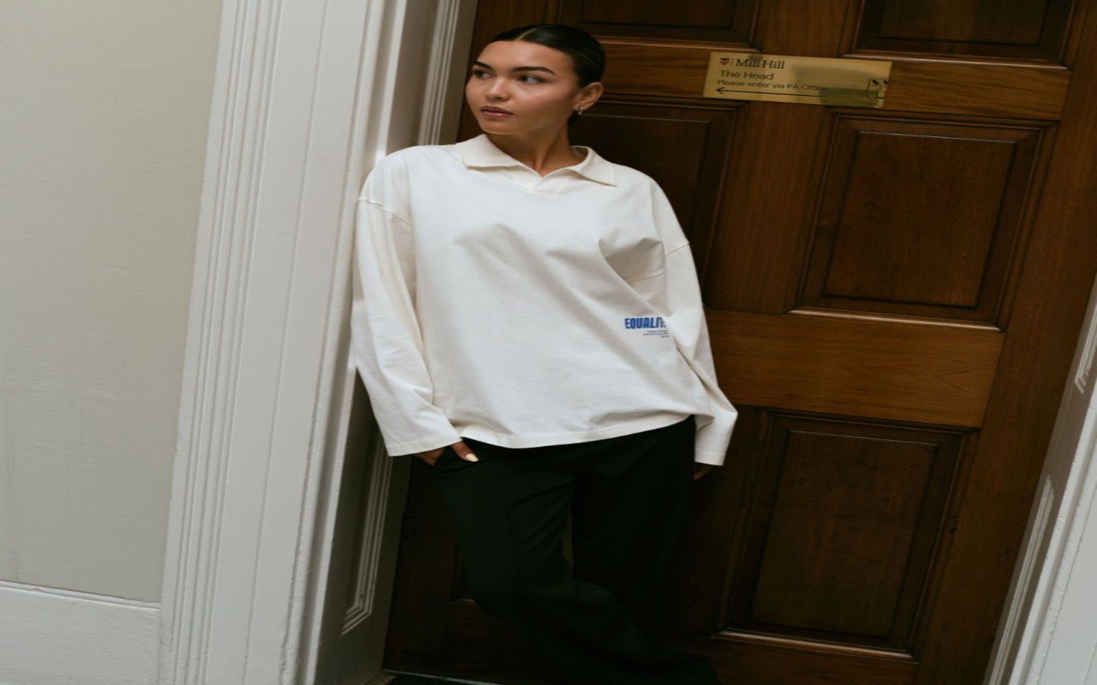 Discover the Equalité Elia Longsleeve Tee in Off-White. This long-sleeved tee has an oversized fit and features a polo collar. The Elia artwork is printed in blue on the side and back.