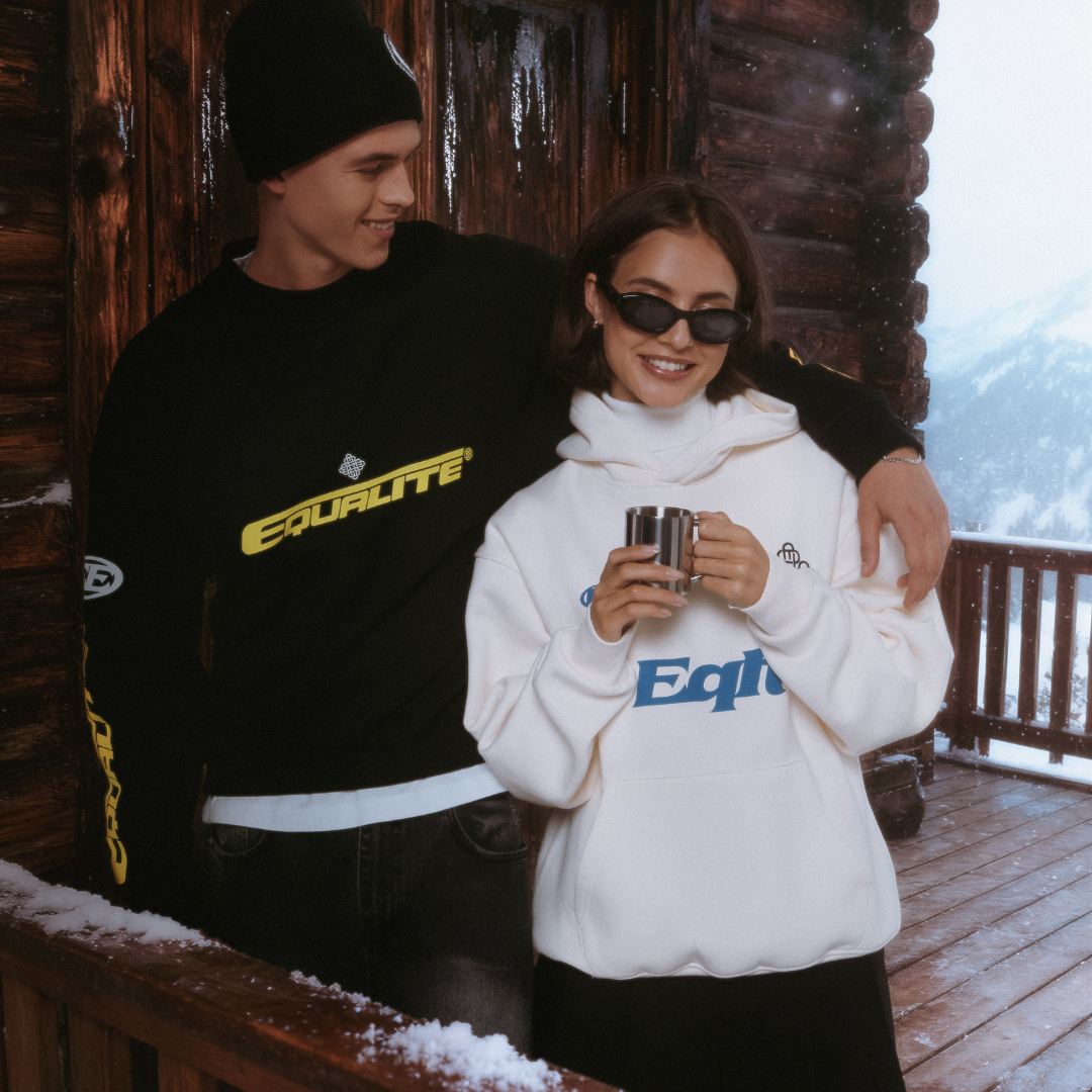 Get to know the Equalité Jersey Oversized Hoodie in Off-White. The hoodie features an oversized fit and hood, a kangaroo pocket, and ribbed cuffs and hem. The chest and back feature blue embroidered artwork of the EQLT logo.