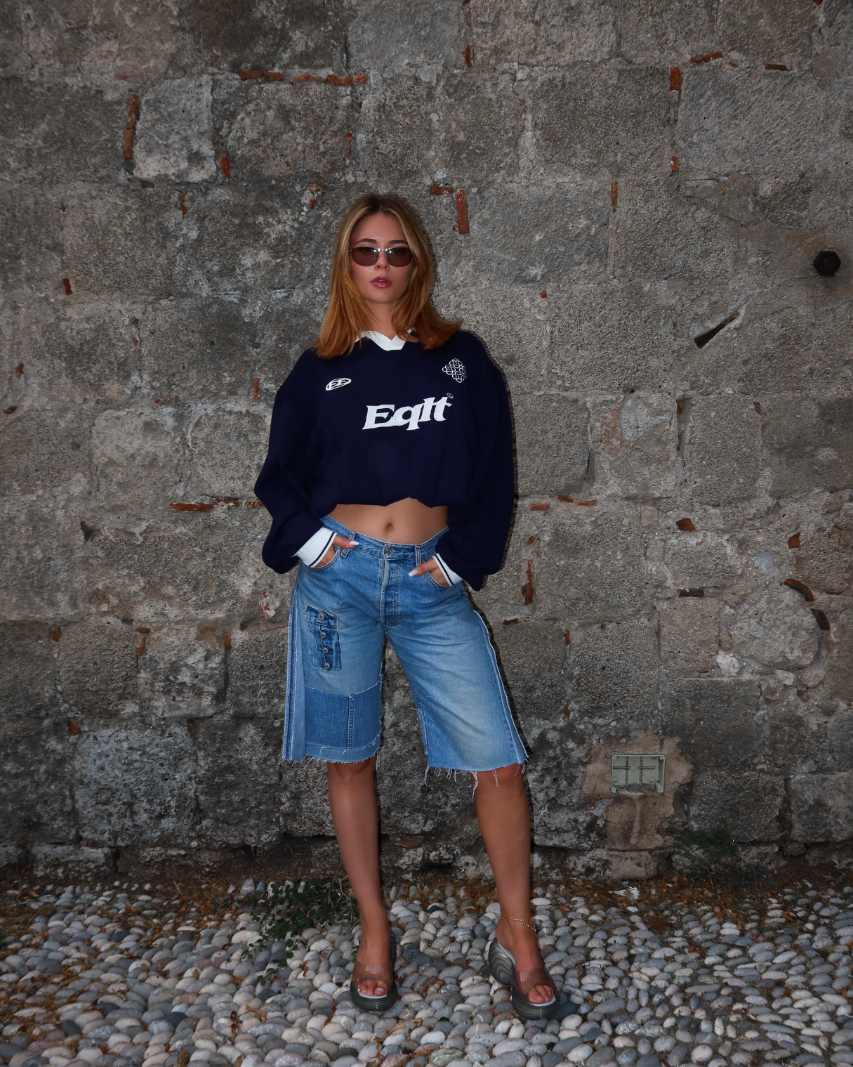 Get to know the Equalité Knit jersey long-sleeve polo shirt in navy. This knit jersey long-sleeve polo shirt has an oversized fit with a polo collar. The chest and back feature white embroidered artwork of the EQLT logo.