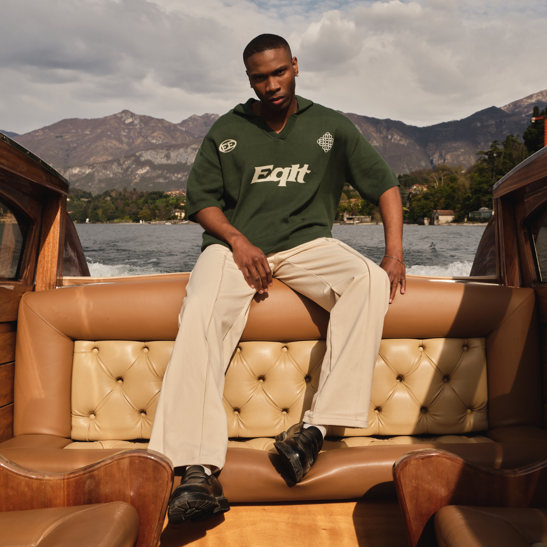 Introducing the Equalité Knit polo tee in Green. The knit polo has an oversized fit with a polo collar. The center of the chest and the back feature a white embroidered artwork of the EQLT logo. The left chest and back also feature a white embroidered signature Societé symbol.