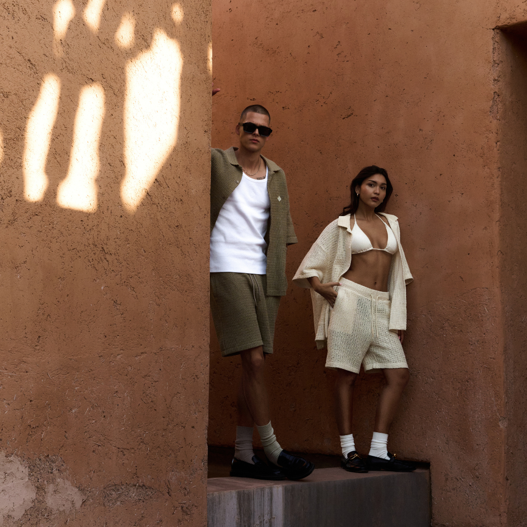 Get to know the Equalité Lyra knitted croched Shorts in taupe. The shorts have an oversized fit with two slit pockets, a mid-rise waist with drawstring and one back pocket. The shorts feature an embroidered Societé symbol on the front of the left leg. The shorts are part of a set and can be combined with a matching shirt.