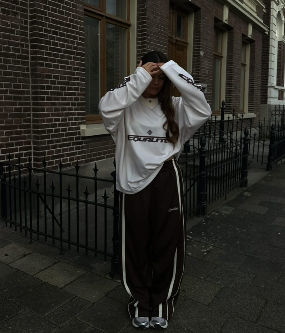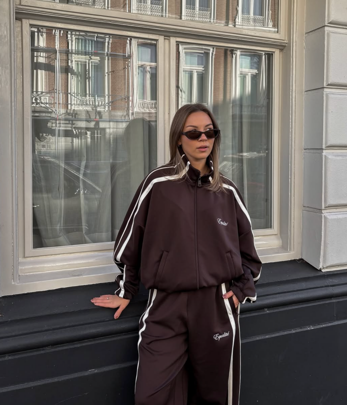 Discover the Equalité x NOA track jacket in Brown. The jacket has an oversized fit and features a mesh lining, a zipper closure, two zippered side pockets, and ribbed cuffs and hem. A white embroidered signature Equalité logo is featured on the left chest, and the symbol logo is on the back. The jacket is part of a set and can be paired with matching pants.