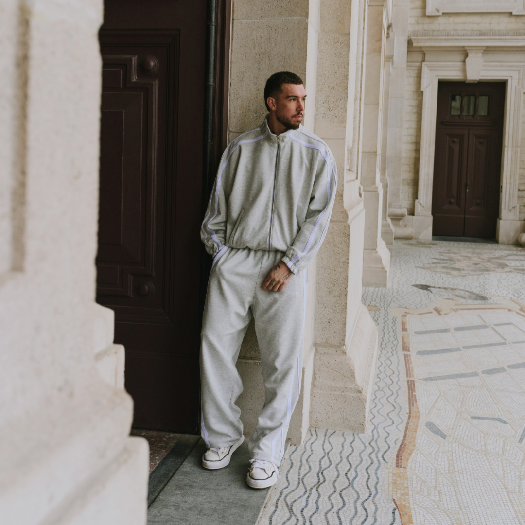 Discover the Equalité track jacket in Melange Grey. The jacket has an oversized fit and features a mesh lining, a zipper closure, two zippered side pockets, and ribbed cuffs and hem. A white embroidered signature Equalité logo is featured on the left chest, and the symbol logo is on the back. The jacket is part of a set and can be paired with matching pants.