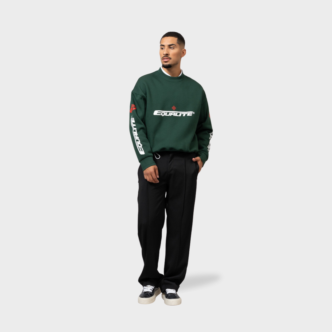 Discover de Equalité Arena Oversized Sweater in Green. De sweater heeft een oversized fit. De sweater is voorzien van een ronde kraag en rode & witte zeefdruk artworks op de borst, rug en mouwen.