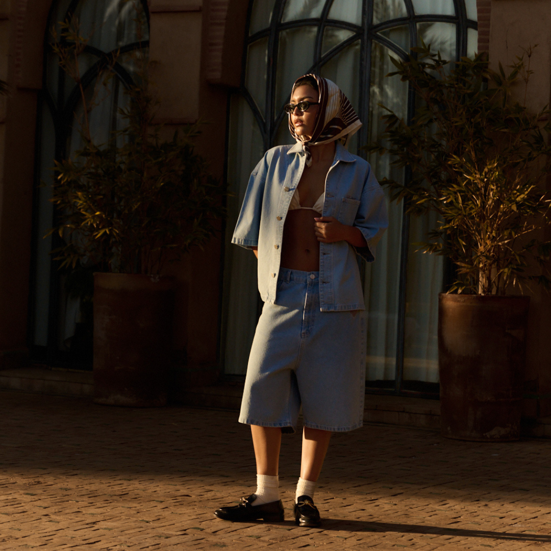 Discover de Equalité Astra denim boxy shirt in blauw. Het shirt heeft een boxy fit en is voorzien van een knoopsluiting, een punt kraag en één steekzak op de linkerborst. Het shirt heeft een geborduurd Societé symbol op de achterkant van de rug. Deze Astra denim boxy shirt is onderdeel van een set en is te combineren met een bijpassende short en straight fit jeans.
