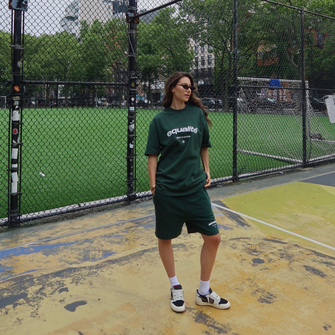 Meet de Equalité Celeste Shorts in groen. De short heeft een oversized fit met twee steekzakken voorzien van een rits, een mid-rise taille met trekkoord en twee achterzakken. De short is voorzien van een witte zeefdruk van het signature Celeste logo op de voorkant van het linkerbeen. De short is onderdeel van een set en is te combineren met twee bijpassende tees.