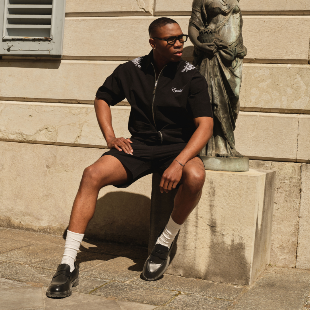 Get to know de Equalité Eli shirt in Zwart. Het shirt heeft een oversized fit en is voorzien van een two way zipper, een punt kraag en twee steekzakken. Het shirt heeft wit geborduurd signature Equalité logo op de linkerborst en geborduurde artworks op de schouders. Het shirt is onderdeel van een set en is te combineren met een bijpassende short.