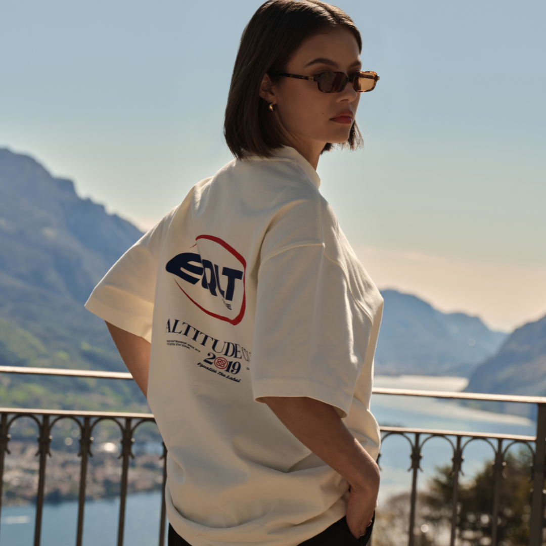 Discover de Equalité Everest Oversized Tee in off-white. De tee heeft een oversized fit met een ronde kraag en is voorzien van een zeefdruk 'Altitude club' artwork op de linkerborst en op de rug.