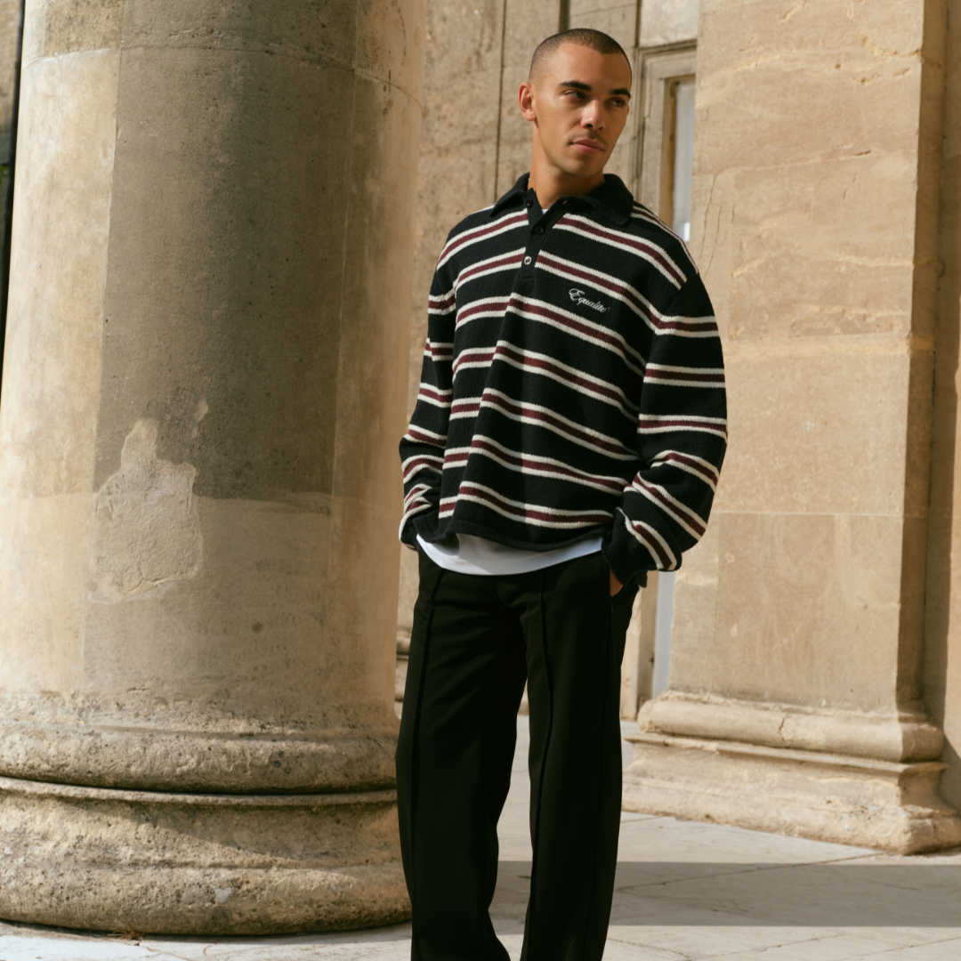 Meet de Equalité Finn knit polo in Striped Navy, Aubergine & White. De polo heeft een oversized fit met een polo kraag voorzien van knopen. Op de linkerborst zit een wit geborduurd Equalité logo.