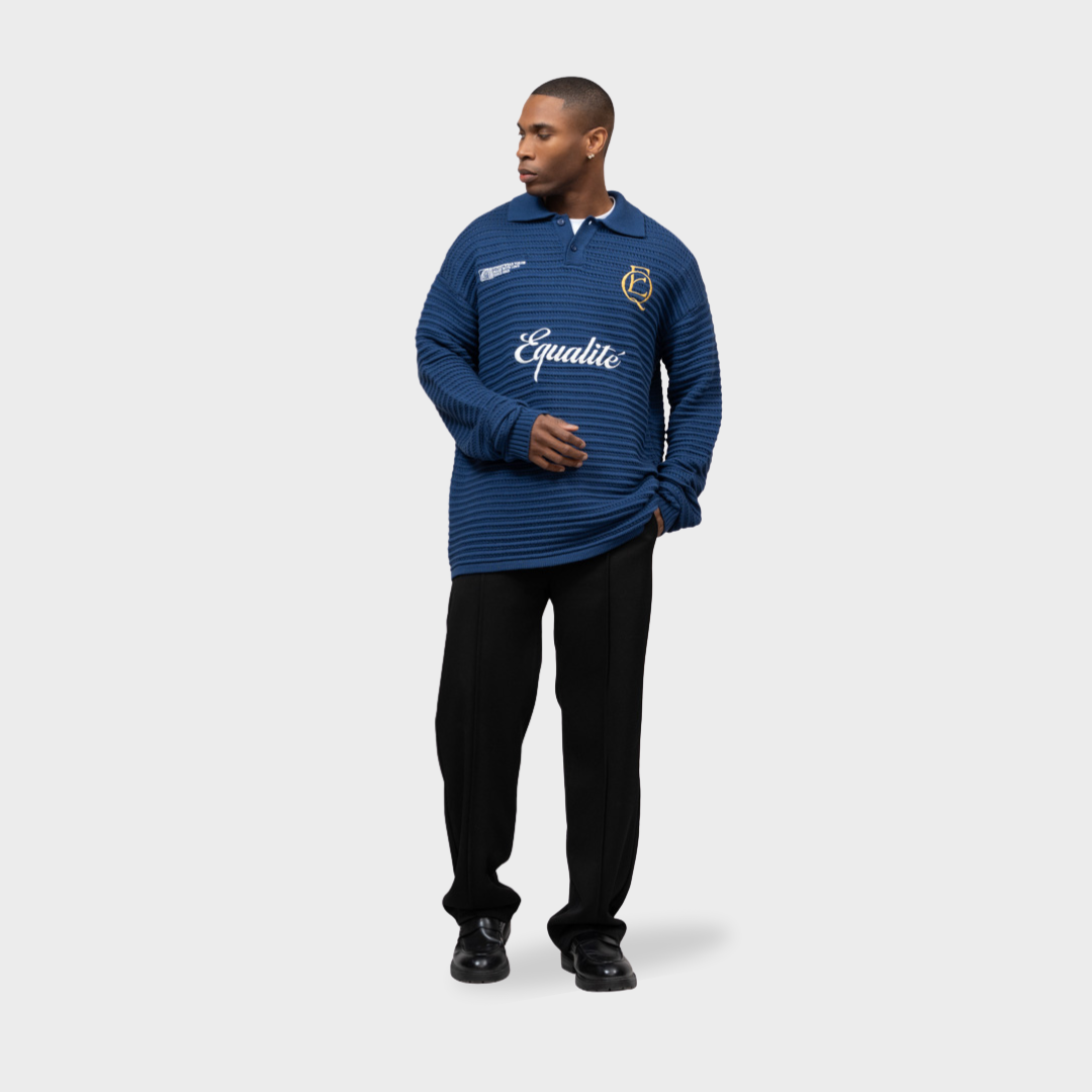 Get to know de Equalité Heritage Rib Knit Polo in Navy. De heritage rib knit polo heeft een oversized fit met een polo kraag. De borst en rug zijn voorzien van een wit geborduurd artwork van het EQLT logo.