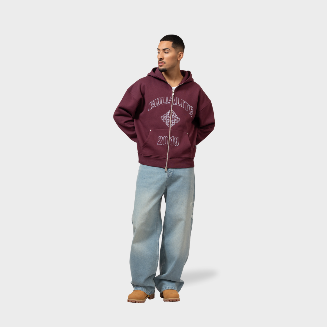 Introducing de Equalité Isa Oversized Full Zip Hoodie in Aubergine. De full zip heeft een oversized fit en is voorzien van een capuchon, two way zipper, twee steekzakken en geribbelde boorden bij de mouwen en onderkant. Op de voorkant zit een geborduurd Isa logo.