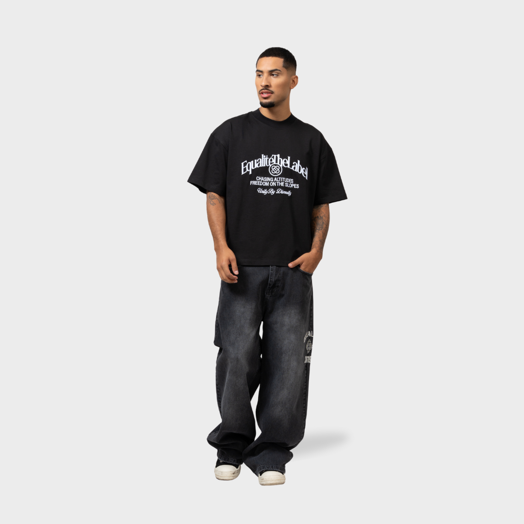 Maak kennis met de Equalité Jules Boxy Tee in Black. De tee heeft een boxy fit met een ronde kraag en is voorzien van een wit geborduurd Jules logo op de borst.