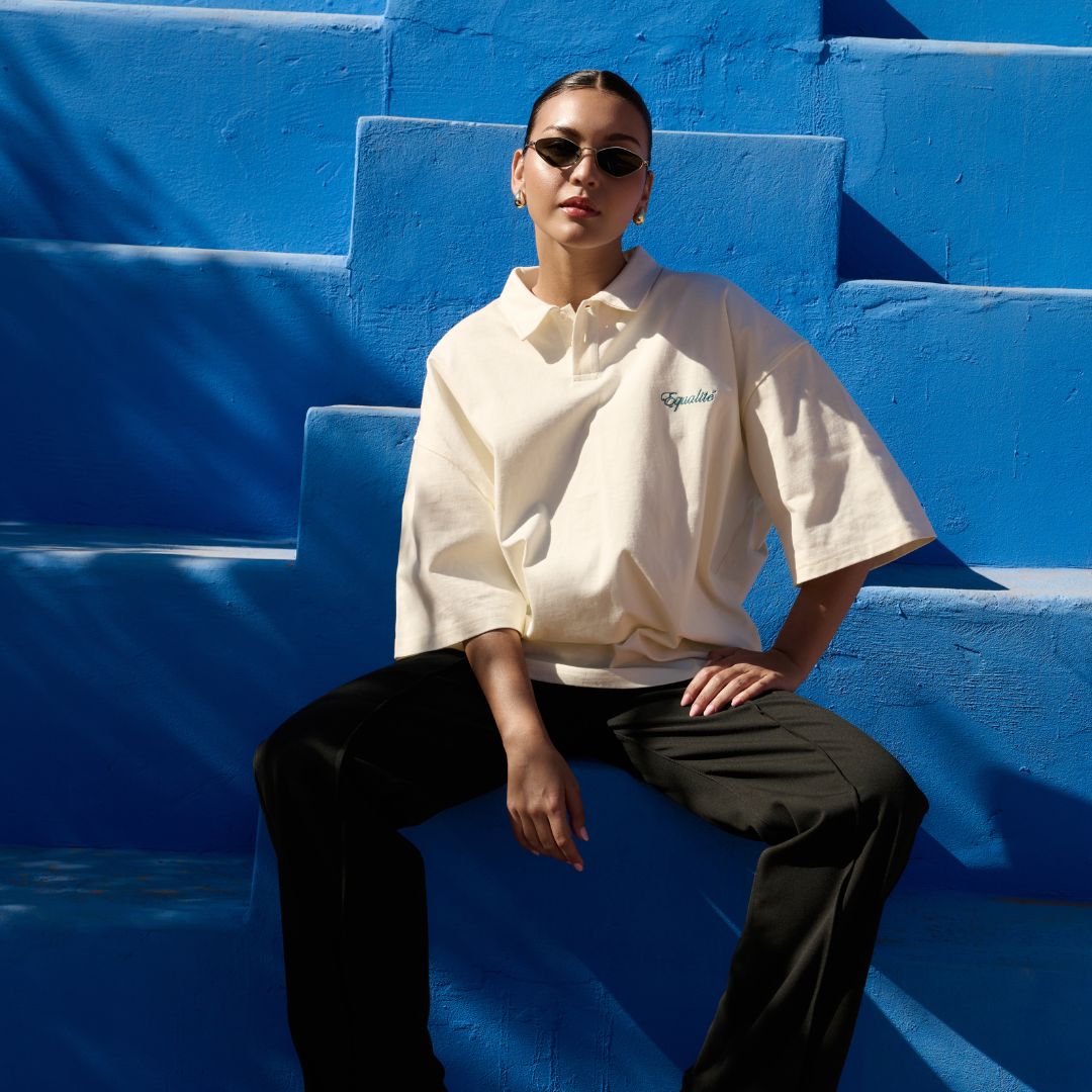 Meet de Equalité Oasis boxy polo in off-white. De polo heeft een Boxy fit en is voorzien van een polo kraag. Op de linkerborst zit een petrol groen geborduurd signature Equalité logo en op de rug een geborduurd artwork.
