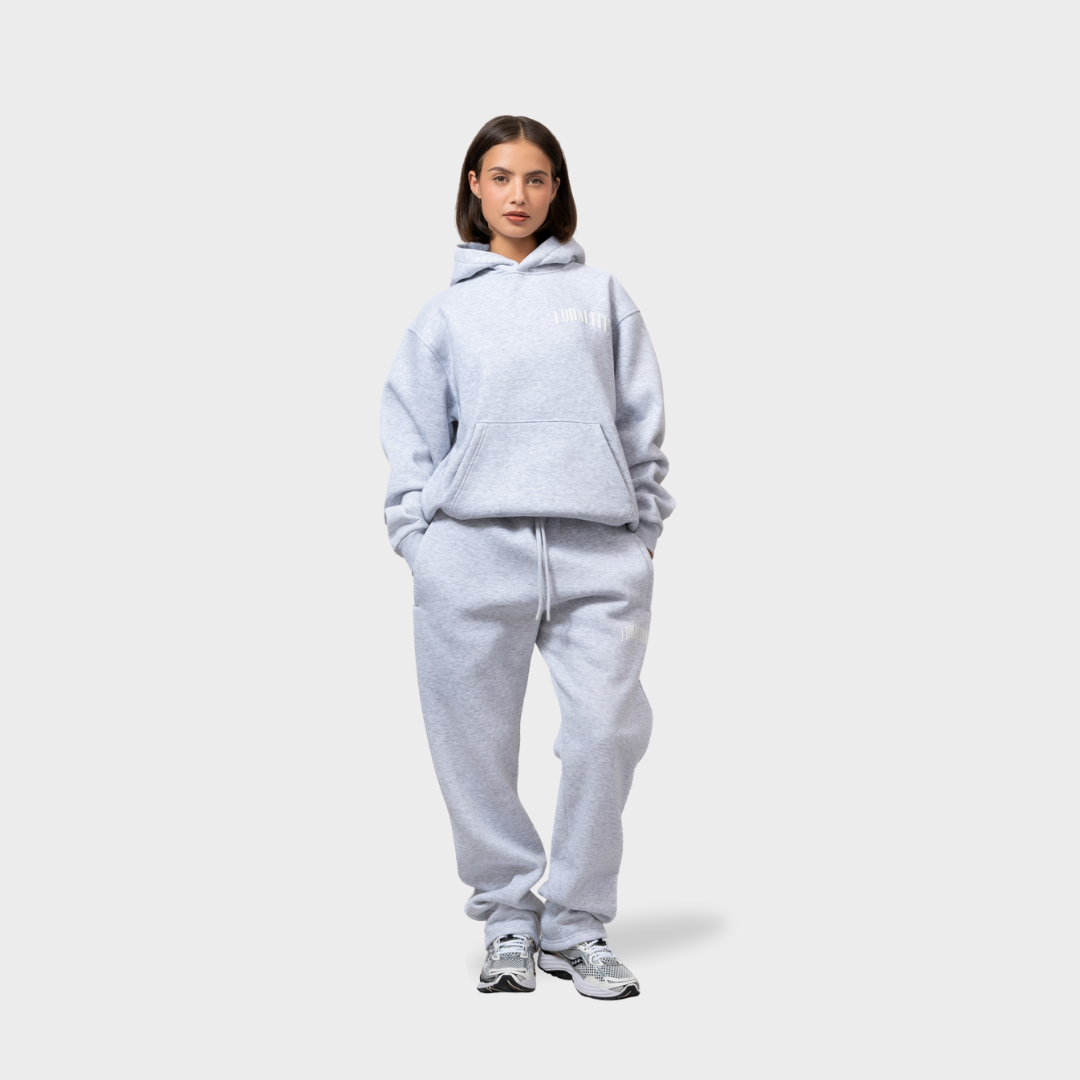 Meet de Equalité Oliver Tracksuit in Melange Grey. De hoodie heeft een oversized fit en is voorzien van een capuchon, een kangoeroezak en geribbelde boorden bij de mouwen en onderkant. De jogger pants heeft een oversized fit met twee steekzakken voorzien van een rits, een mid-rise taille met trekkoord en twee achterzakken. De set is voorzien van een witte puffdruk van het signature Oliver logo op de linkerborst, de rug en de voorkant van het linkerbeen.