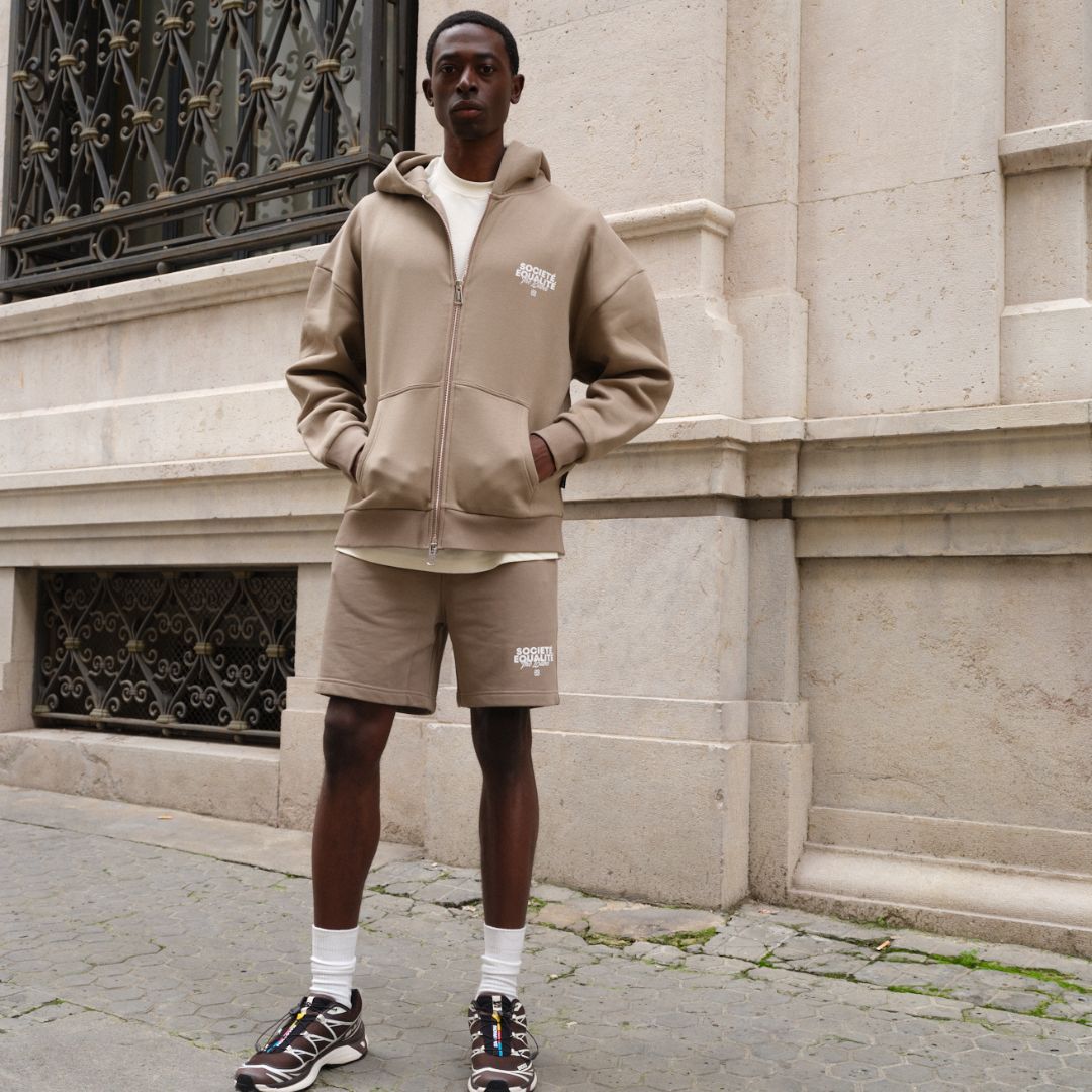 Get to know de Equalité Societé 2.0 Oversized Shorts in Taupe. De short heeft een oversized fit met twee steekzakken voorzien van een rits, een mid-rise taille met trekkoord en twee achterzakken. De short pants is voorzien van een witte zeefdruk van het signature Societé logo op de voorkant van het linkerbeen, geïnspireerd op onze exclusieve Membersclub. De short is onderdeel van een set en is te combineren met een bijpassende full zip hoodie en tees.